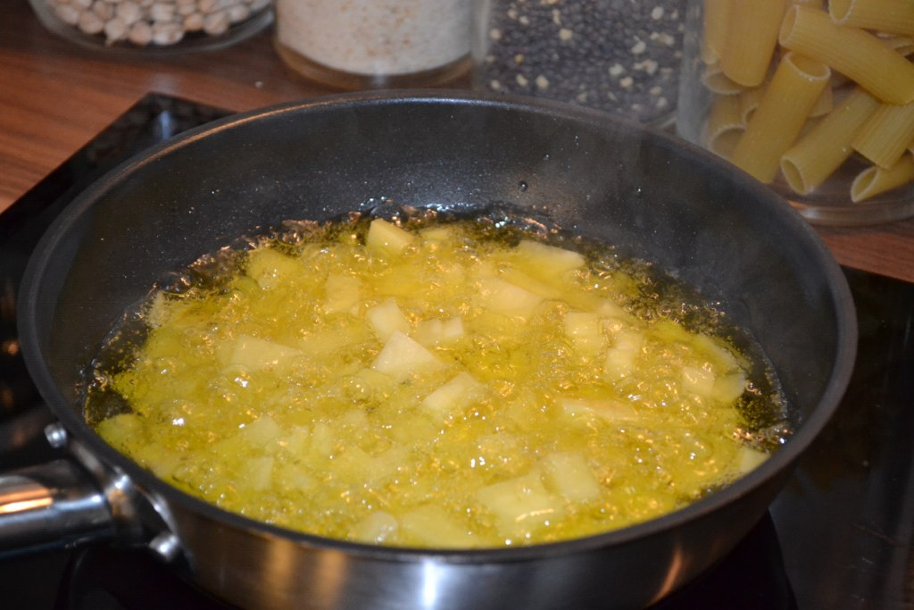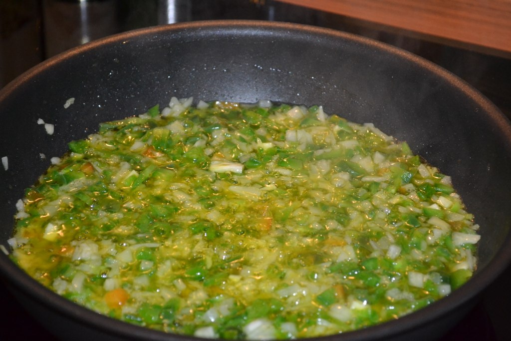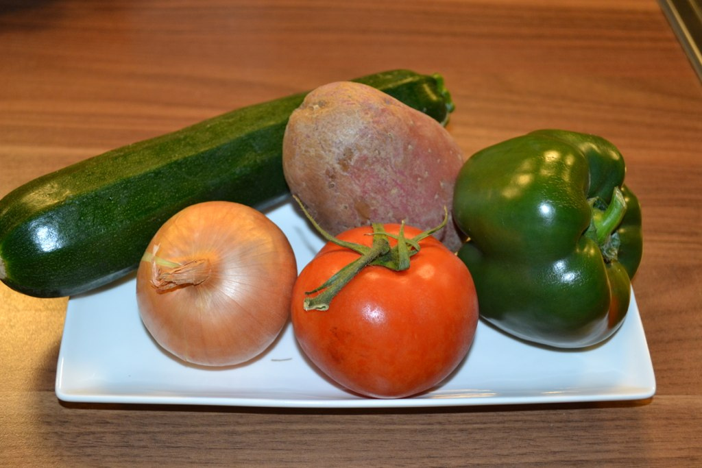 Cortar en cuadritos el calabacín, el pimiento, el tomate sin piel y semillas y la patata. Picar la cebolla.