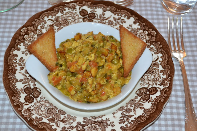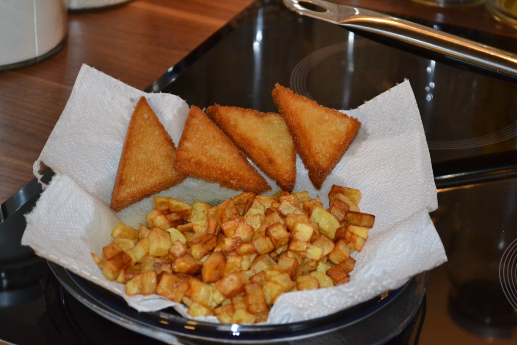 Batir los huevos y volcar en la sartén de la verdura, añadiendo la patata y hacer un revuelto. Servir acompañado de los triángulos de pan frito.