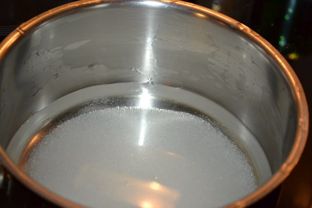 Poner el agua y el azúcar al fuego para hacer un almíbar. Cocer 5 minutos y retirar.