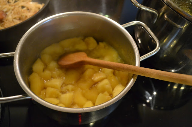Con la cuchara de madera, ir rompiendo la manzana cuando empieza a estar blanda.