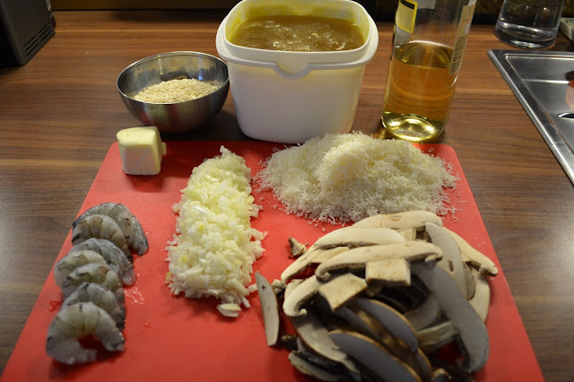 Picar la cebolla, laminar el champiñón, rallar el queso y pelar las gambas.
