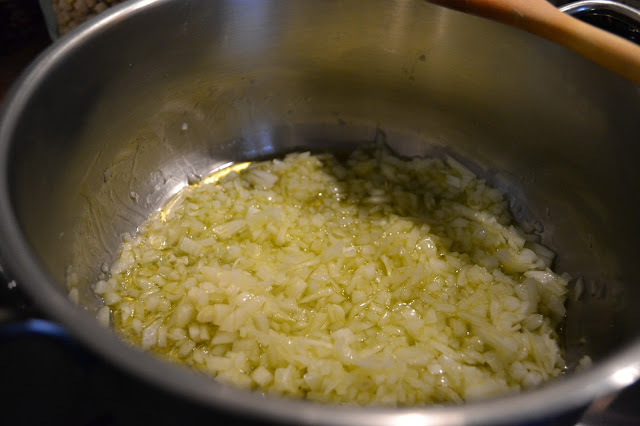 Pon a calentar el caldo a fuego alto y la cebolla a fuego medio. Añade el arroz a la cebolla.