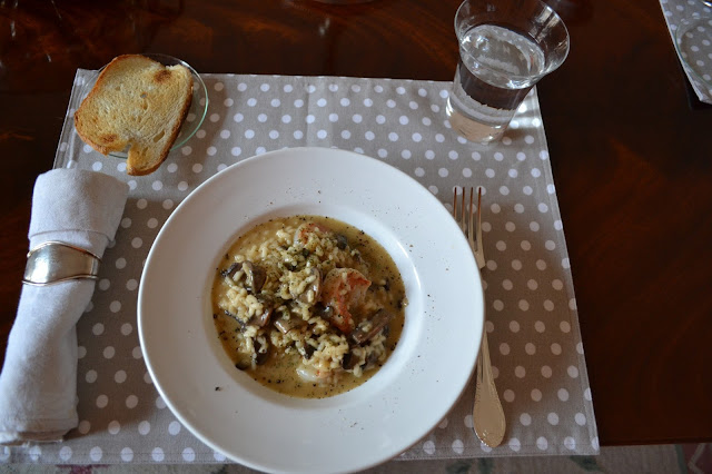 Añade el final del caldo (si se ha terminado siempre puedes poner un poco de agua), retíralo del fuego y añade la mantequilla, el queso, las gambas y los champiñones.