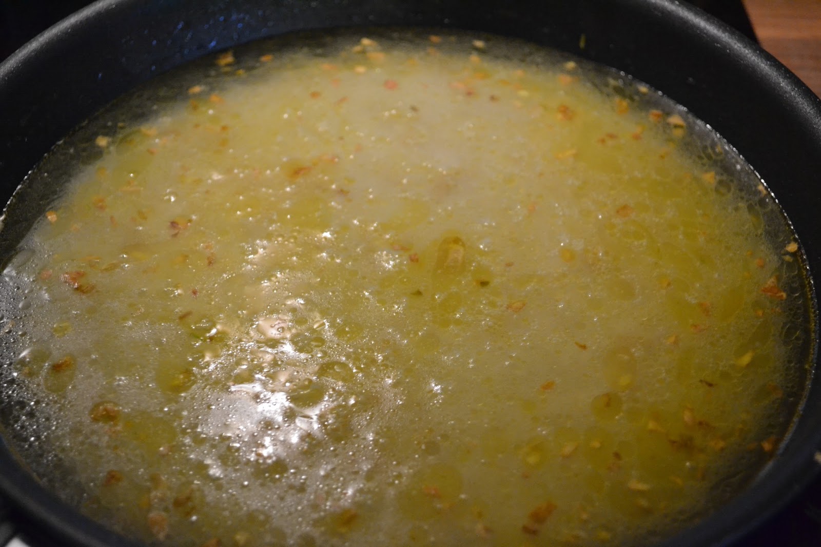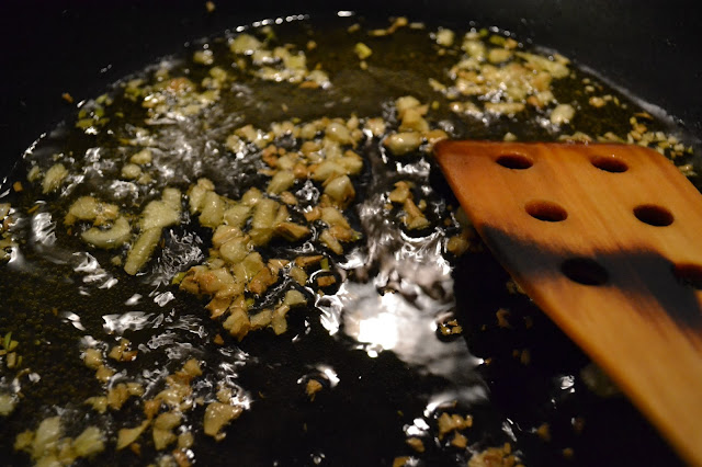 Picar los dientes de ajo y ponerlos a fuego medio con el aceite.