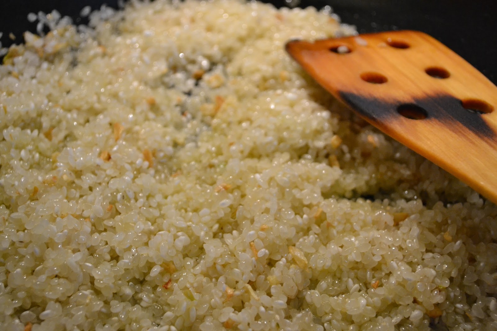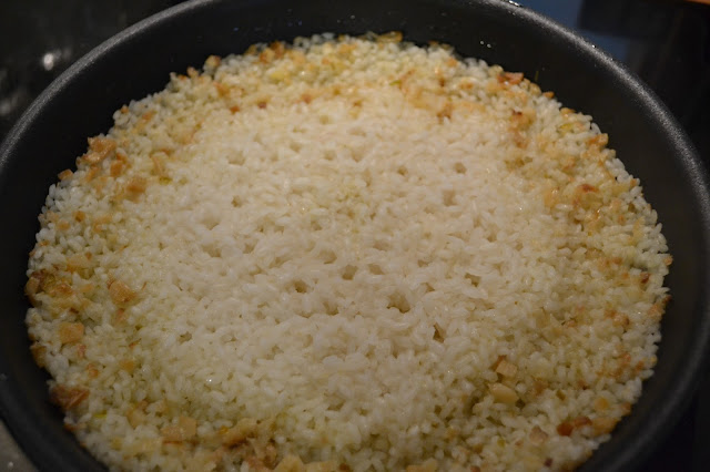 Añadir el arroz, subir el fuego a medio-alto y remover continuamente durante unos 2 ó 3 minutos.