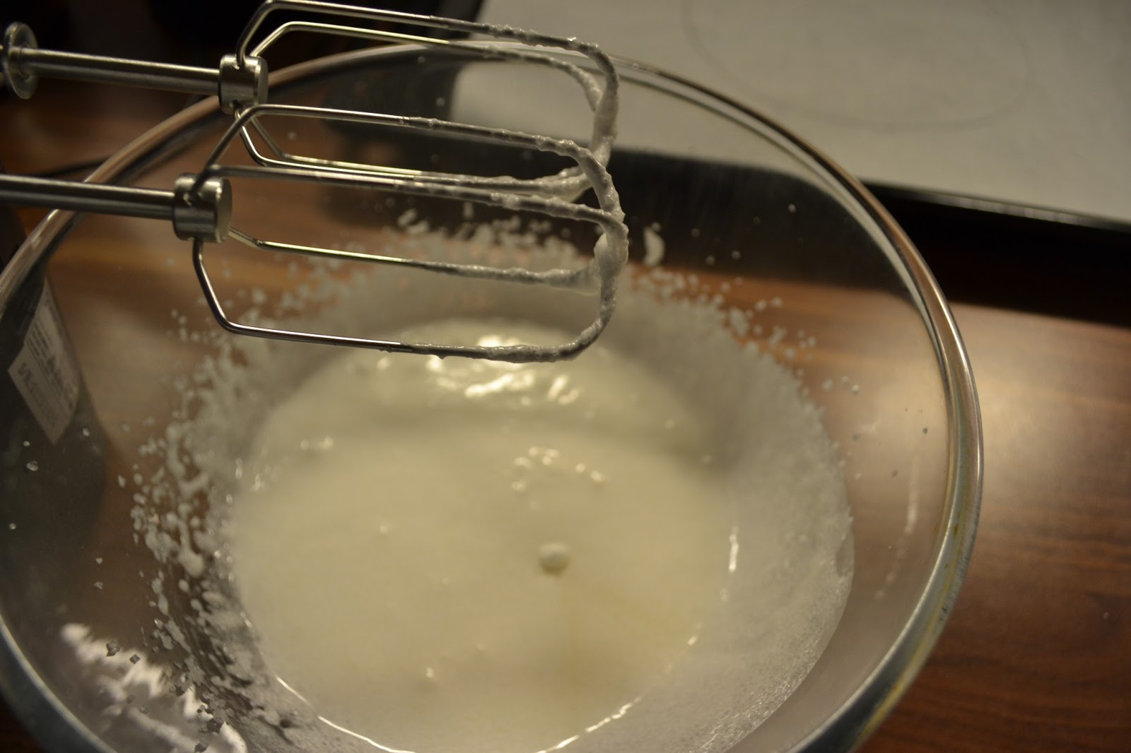 Cuando quedan las marcas de las varillas y cogiendo un poco con el dedo no se nota el azúcar es que está listo. Otro sistema es dar la vuelta al bol, pero las primeras me parecen más fáciles.