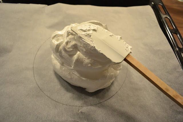 Precalentar el horno a 140º. Pintar en un papel antiadherente un círculo de unos 20 cm con un rotulador (un plato de postre puede servir de referencia). Darle la vuelta al papel y ponerlo en una fuente de horno.