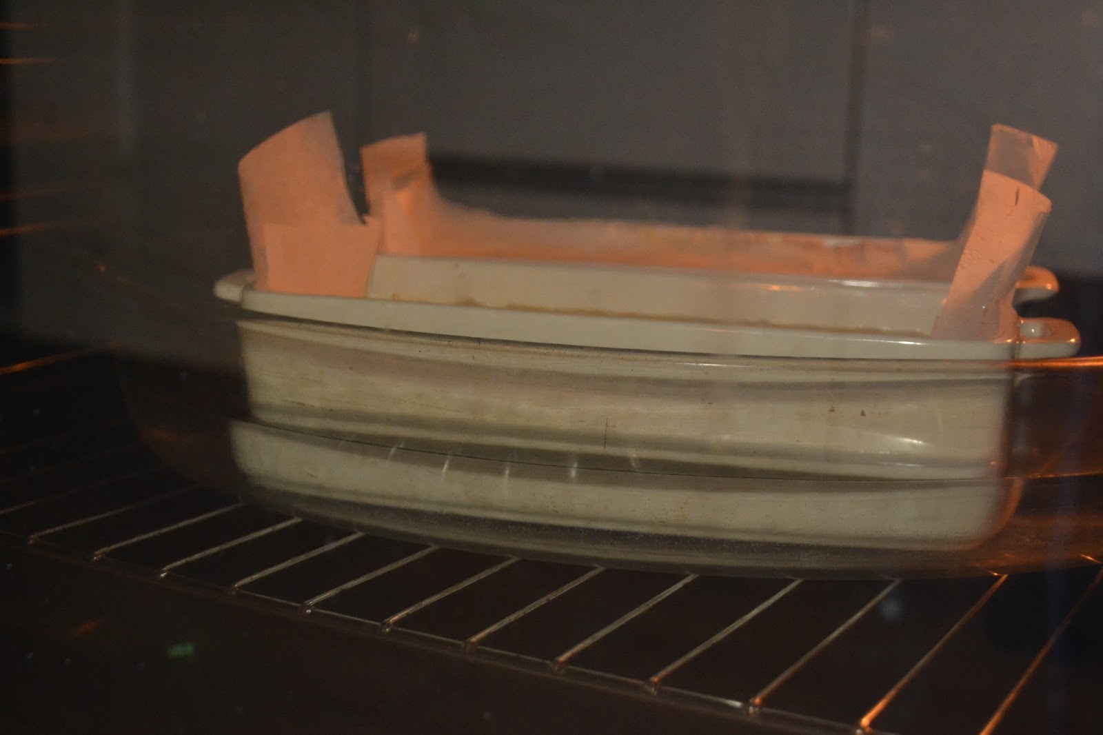 Rellenar el molde y poner otra tira de papel untada con mantequilla.