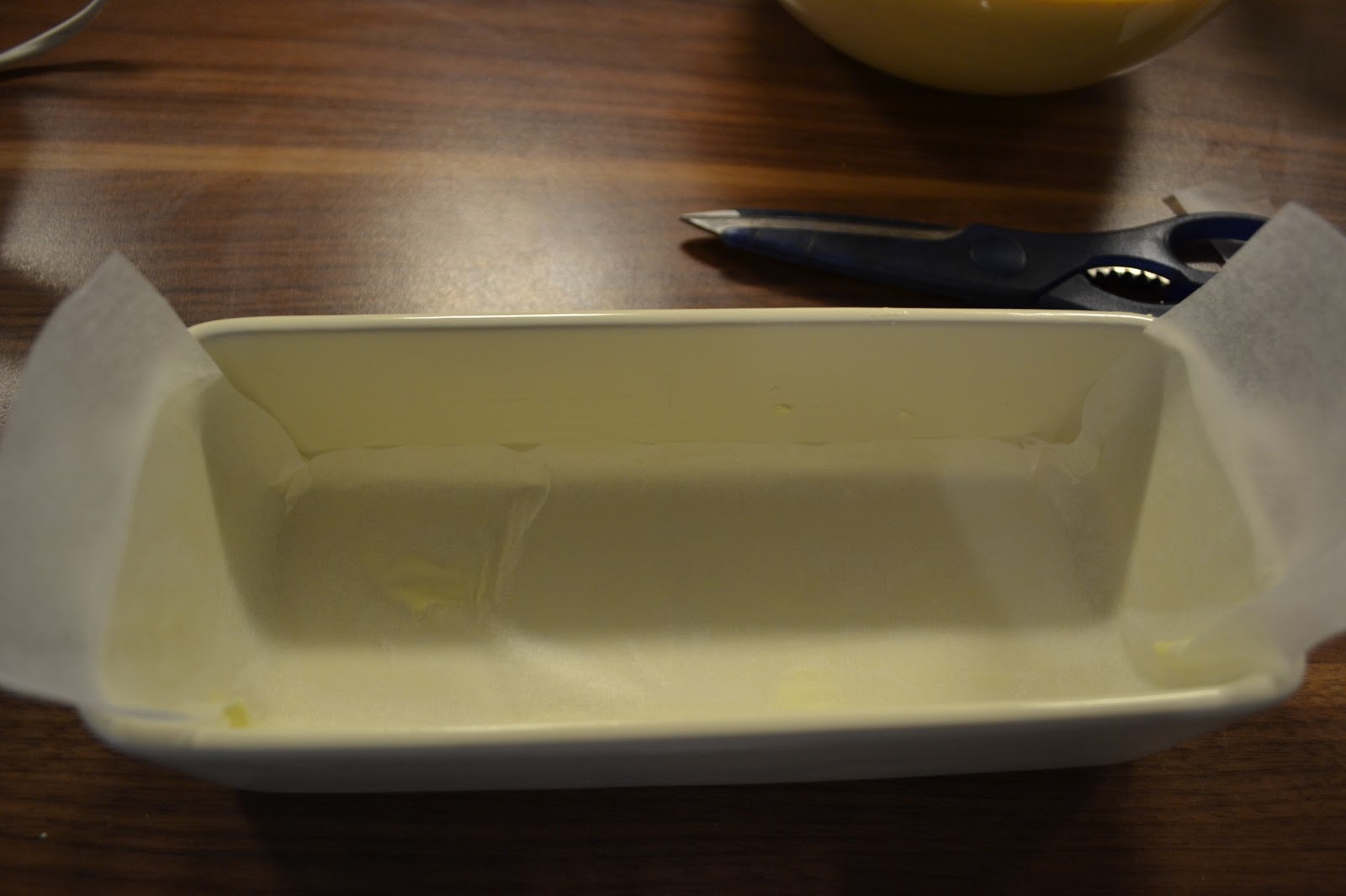 Untar con mantequilla un molde. Yo pongo dos moldes y así congelo uno para otro día. Cortar una tira de papel antiadherente o de plata.
