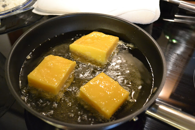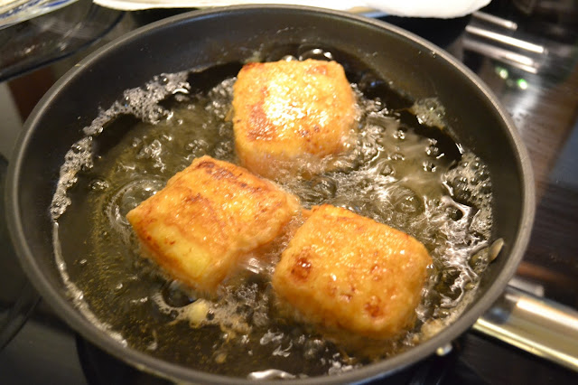 Pasa los cuadritos por harina, sacudiendo el exceso con un golpecito, pásalos por el huevo batido,