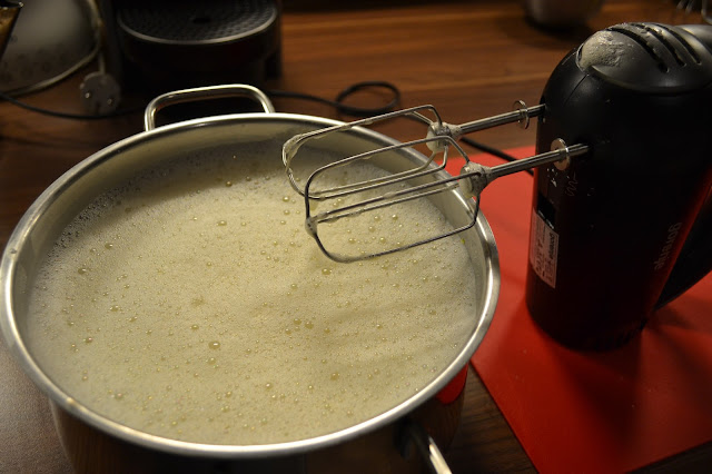 Añádele la leche tibia batiendo todo el rato. Vuelve a poner la mezcla en el cazo.