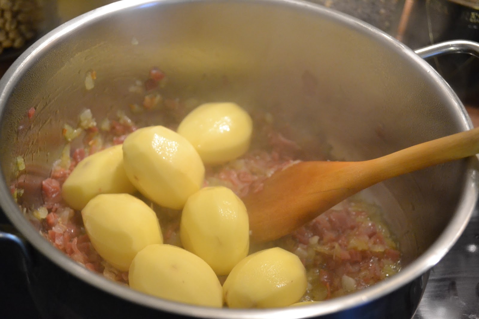 Pela las patatas, pica la cebolla, pica el jamón y el ajo.