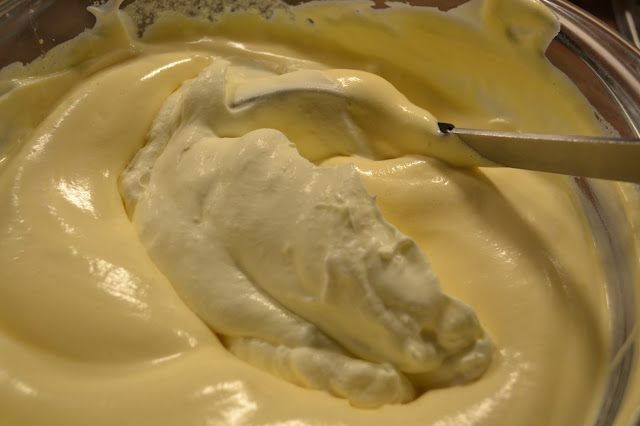 Mezcla la nata de la misma forma en 2 tiempos. Se trata de conservar todo el aire que puedas del que has metido al batir todo.