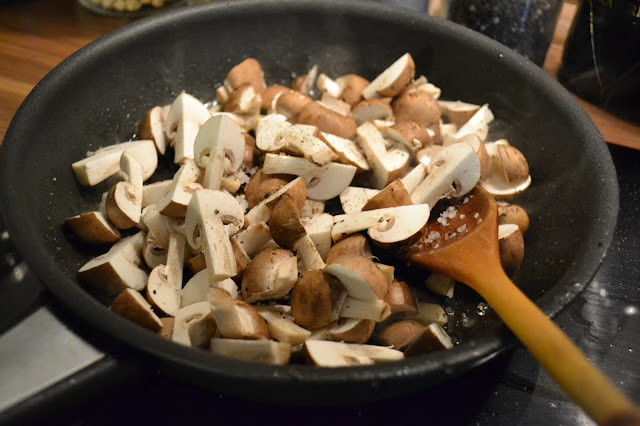 Pon una sartén a fuego-medio alto con un poco de aceite y cuando esté caliente añade el champiñón. Añade sal y pimienta negra.