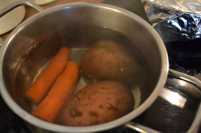 Lleva a ebullición y a partir de entonces cuenta que tardarán al menos 18 minutos. Pincha con un palito de madera o un cuchillo de punta fina y cuando entre sin presión sácalas. (A mi la zanahoria me ha tardado 20 minutos y las patatas casi 30).