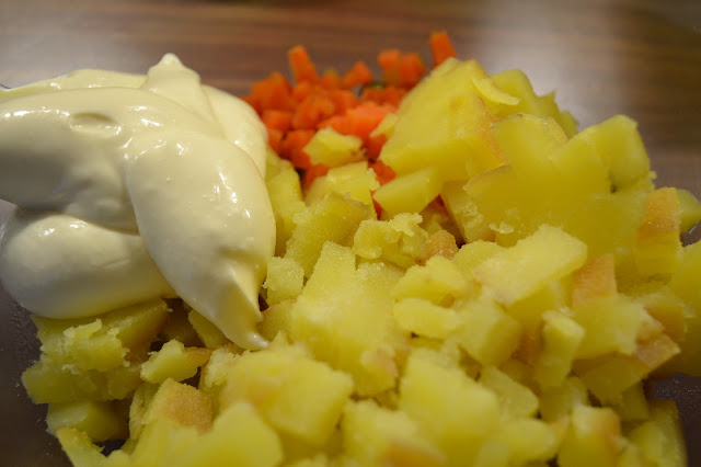 Pela las patatas cuando estén templadas, corta zanahoria y patata en cuadritos y añádelo al bol donde habrás puesto guisantes y el bonito con su aceite desmenuzado. Añade un chorro de mayonesa y sal.
