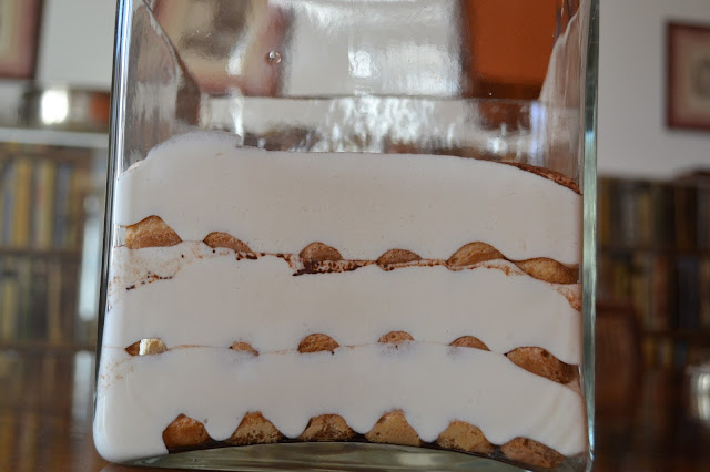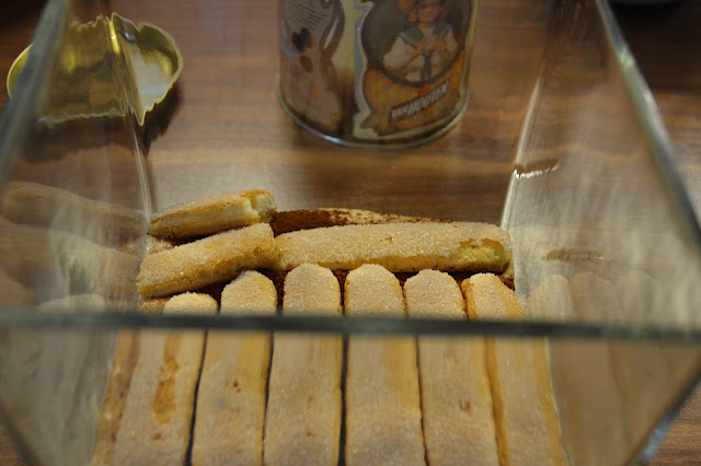 Coloca en una fuente (mejor de cristal) una capa de bizcochos mojados en el café. Tendrás que mojarlos más o menos dependiendo de cuanto quieras que sepa a café.