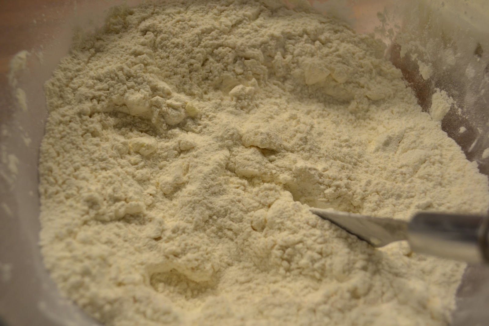 Te acabarán quedando unas migas. Añade la mitad de la leche y sigue mezclando con el cuchillo.