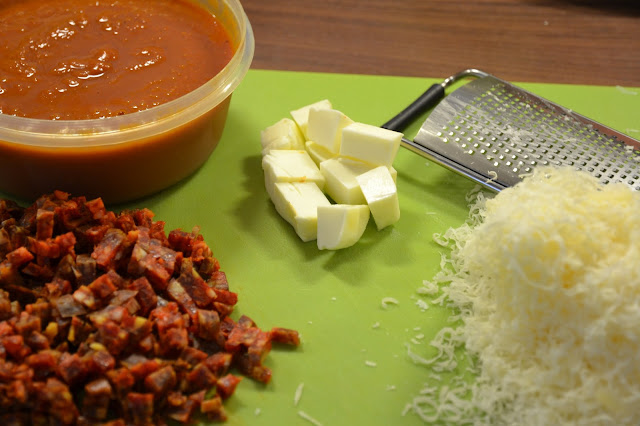Corta el chorizo pequeño, la mantequilla en dados y ralla el queso.