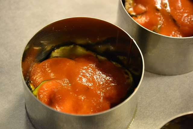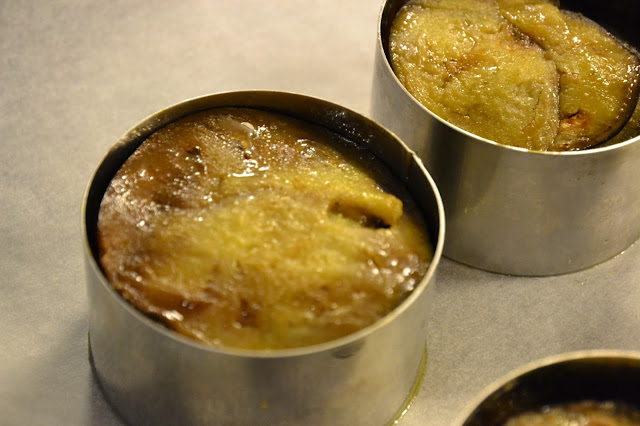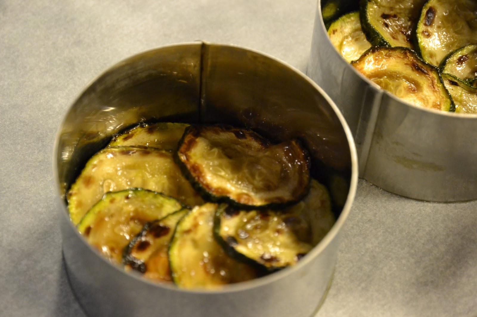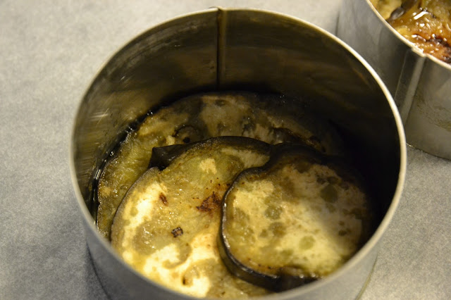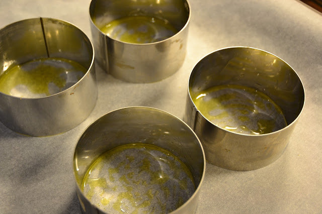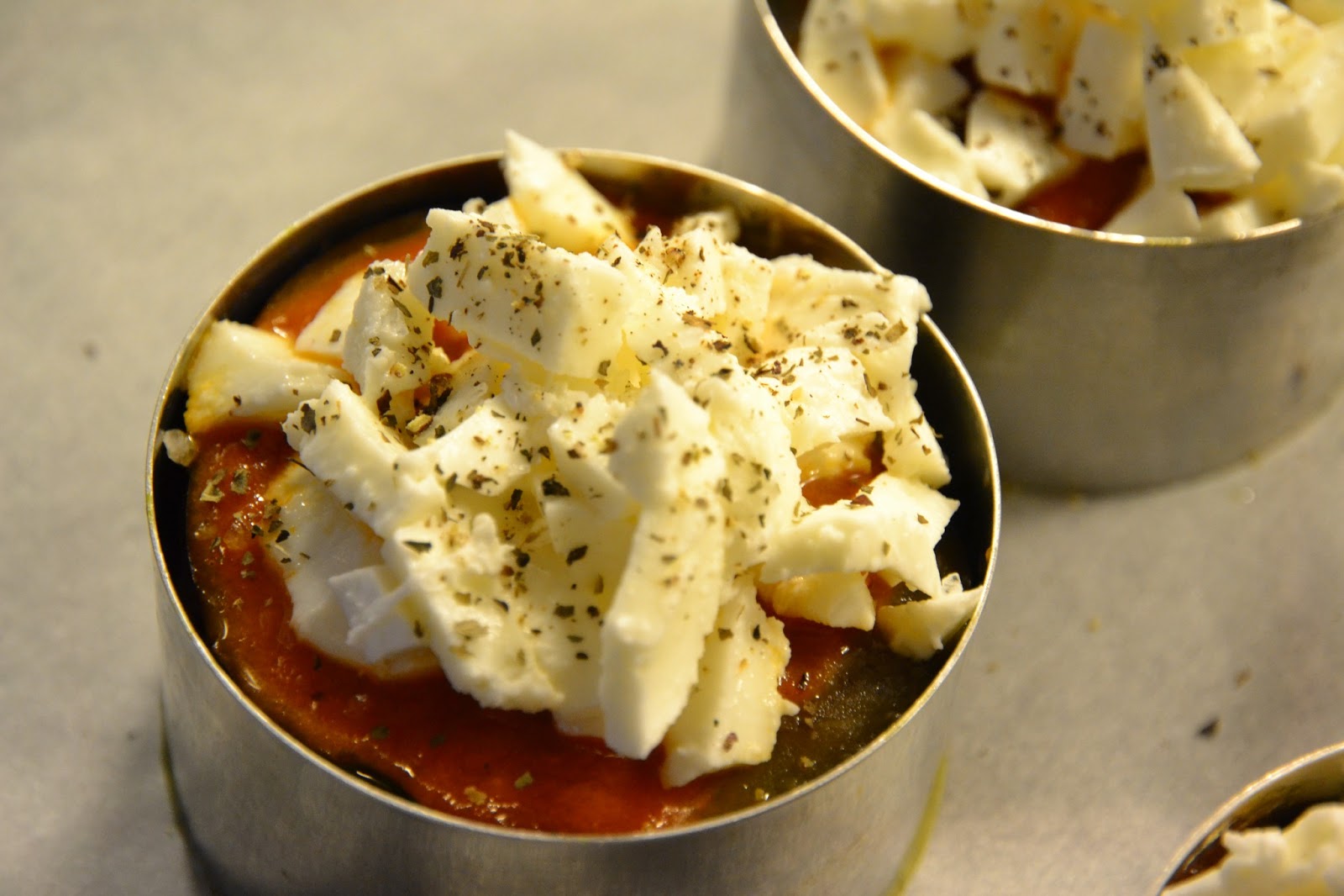Utiliza unos aros de 8 cm. de diámetro que encontrarás en cualquier tienda donde vendan cosas de cocina. Ponlos en la fuente de horno sobre un papel y pinta con unas gotas de aceite el fondo.