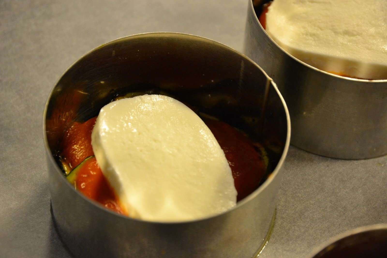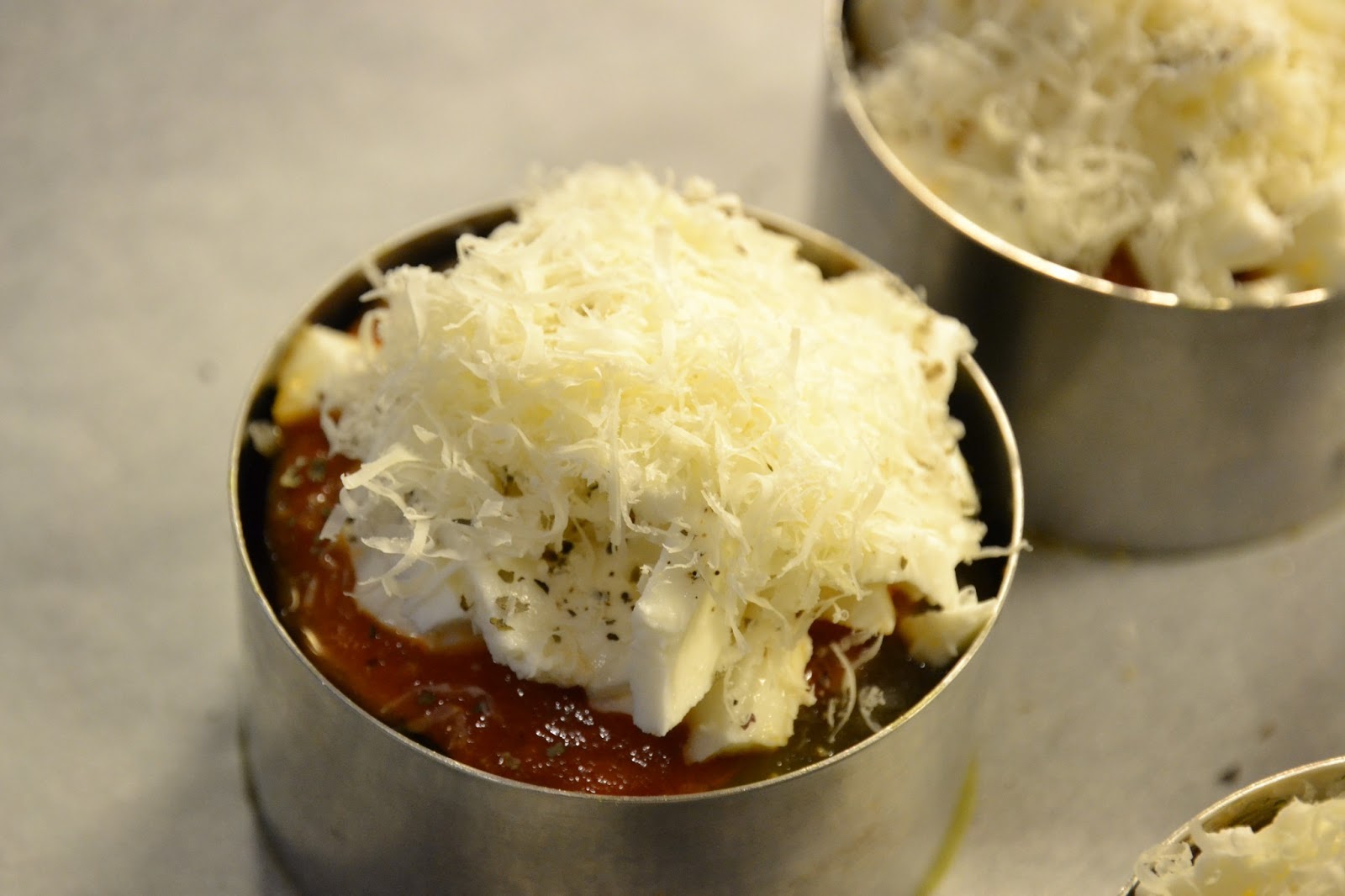 Pon otra cucharada de tomate, el resto de la mozzarella cortada en trocitos, sal, pimienta y albahaca.