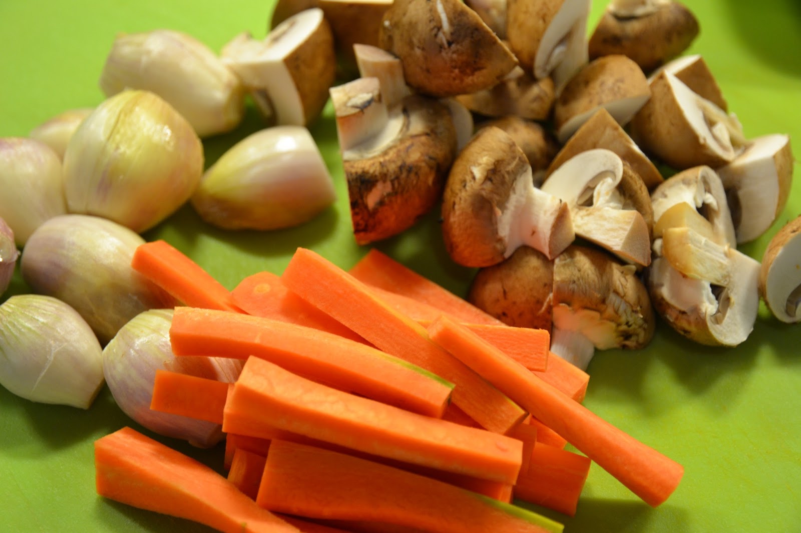 La hoja de laurel, la cebolla con los clavos pinchados, la zanahoria cortada en bastoncitos, el ajo y el puerro.