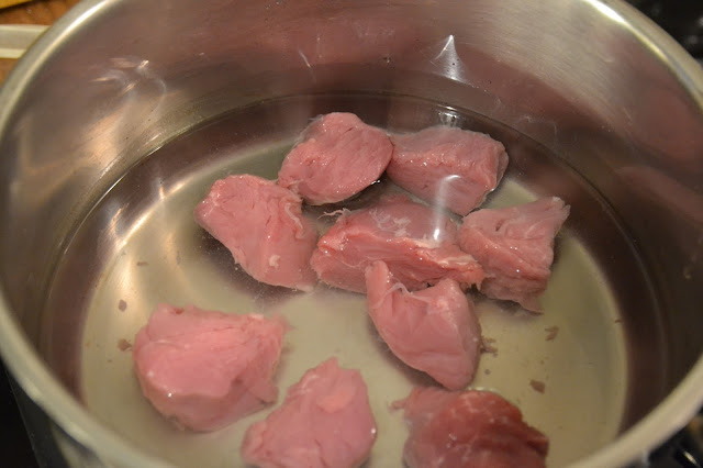 Poner la carne limpia en una cazuela con agua fria que la cubra.