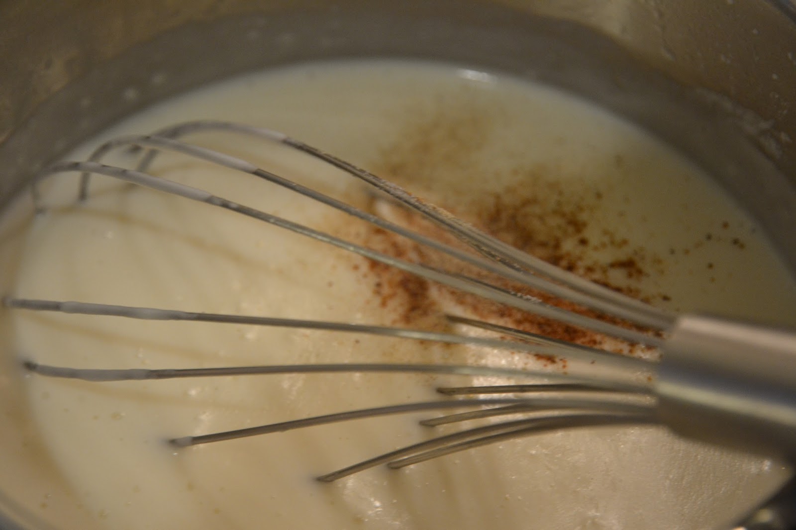 Añade la sal, pimienta blanca y nuez moscada.