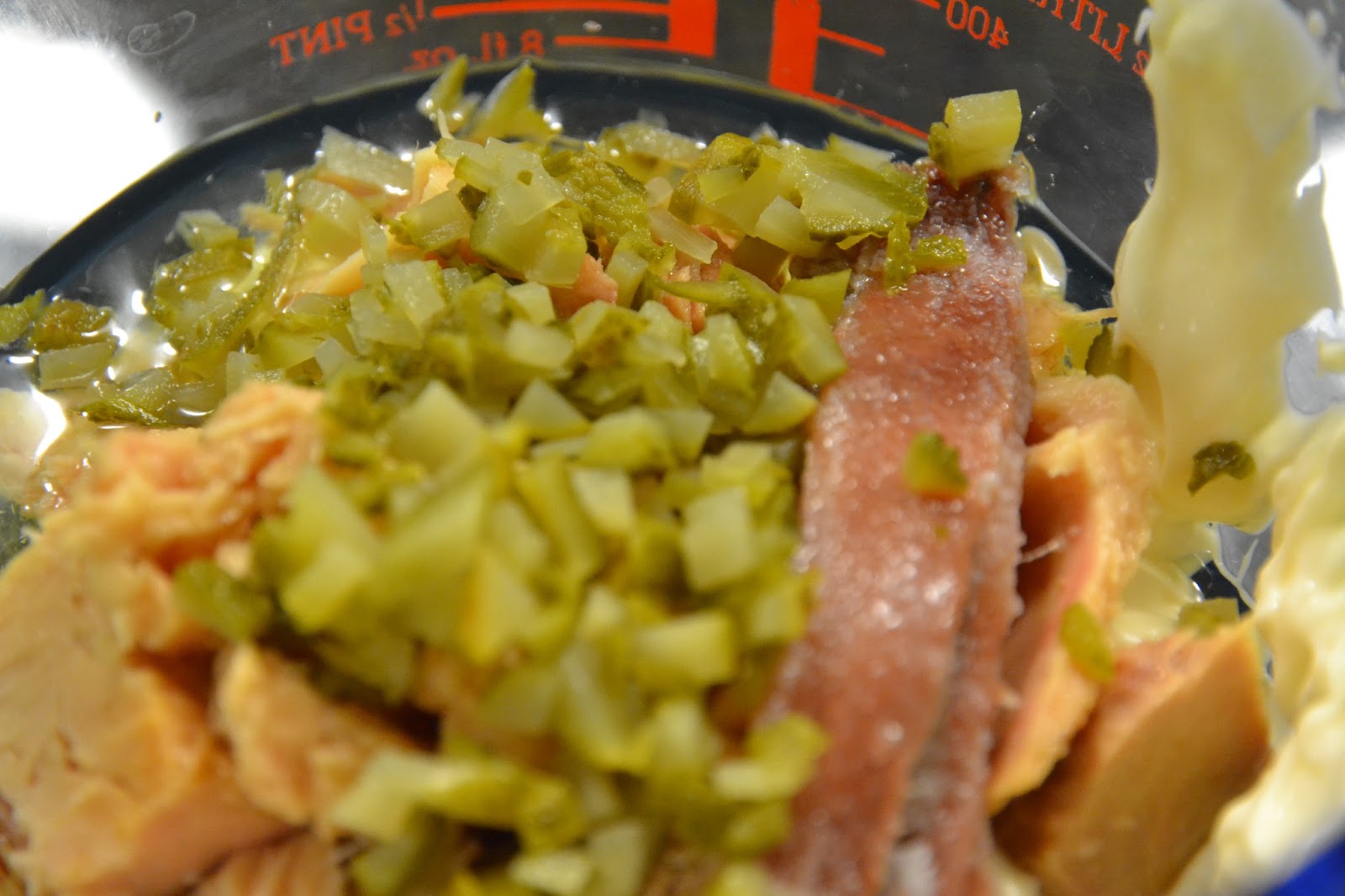 Para la salsa pon la mayonesa, el bonito, las anchoas y el pepinillo en un bol.