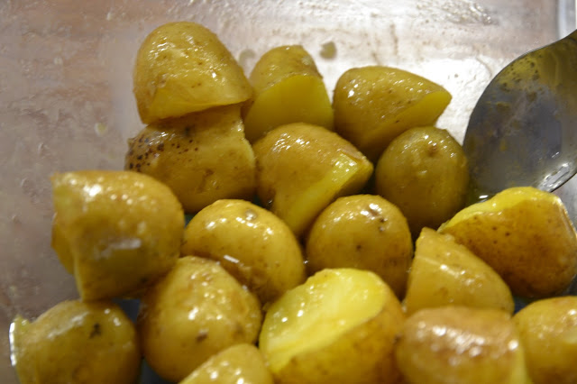Las he escurrido y calientes las he partido por la mitad y les he puesto un poco de vinagreta.