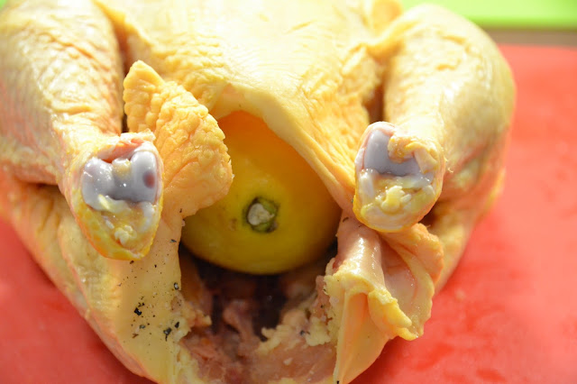 Pon sal y pimienta al interior del pollo y métele un limón.
