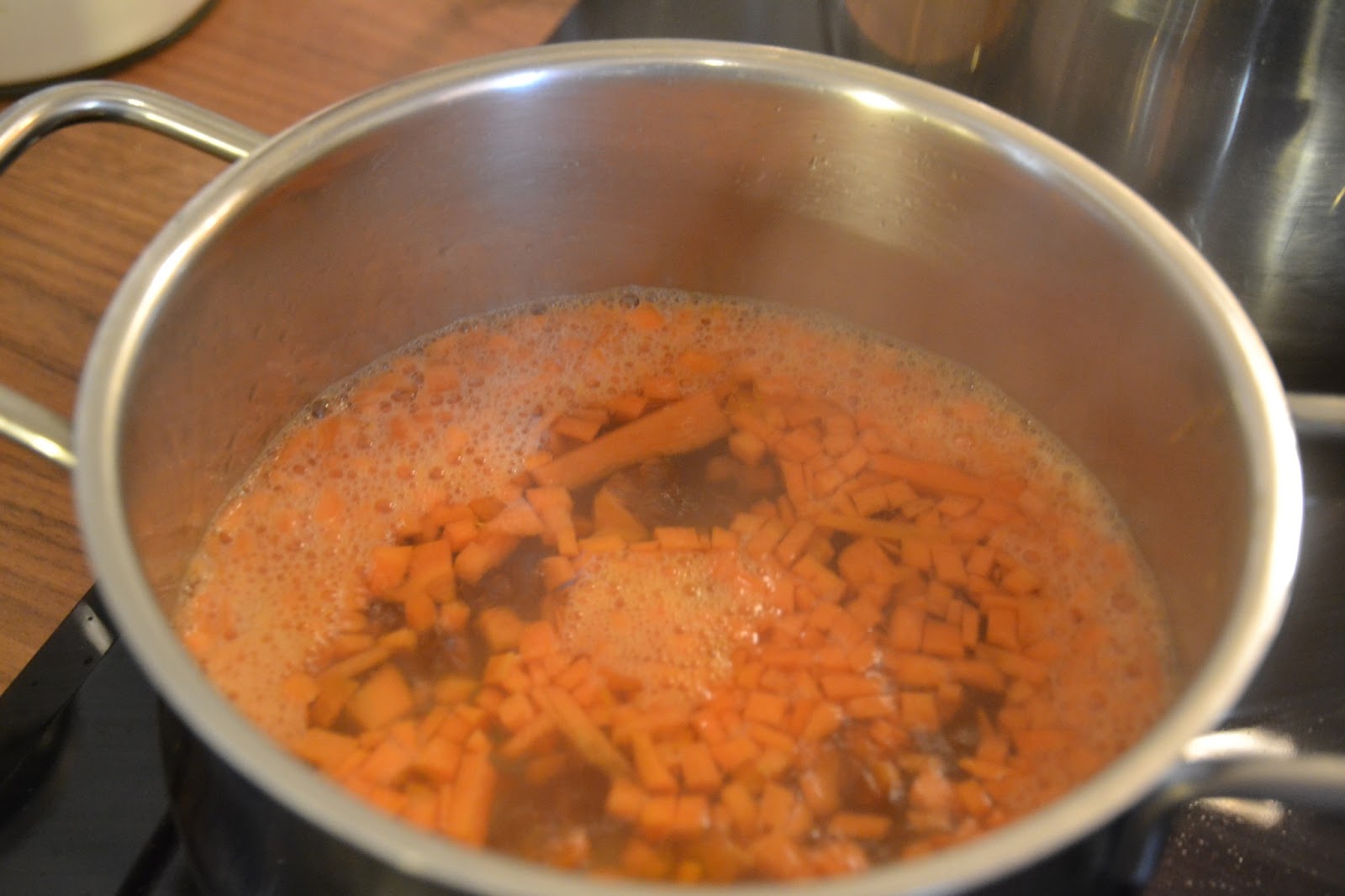 También en agua hirviendo con sal cuece las zanahorias partidas pequeñas 10 minutos.