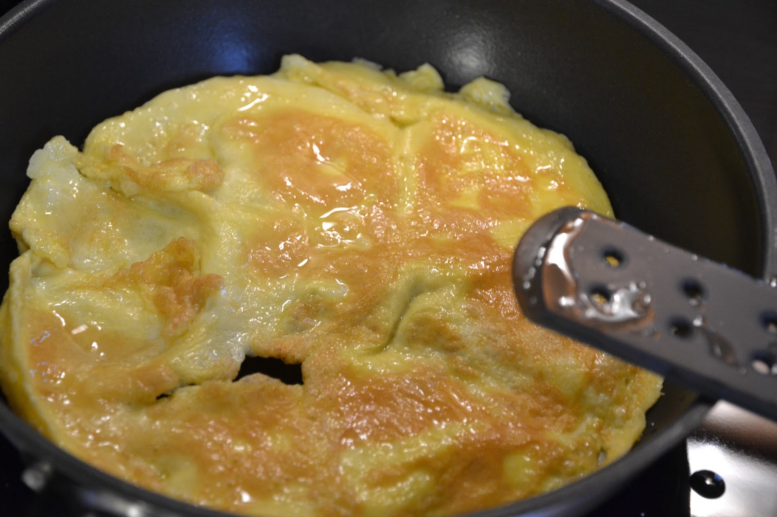 Con una gota de aceite y en una sartén antiadherente haz dos tortillas con los huevos batidos.