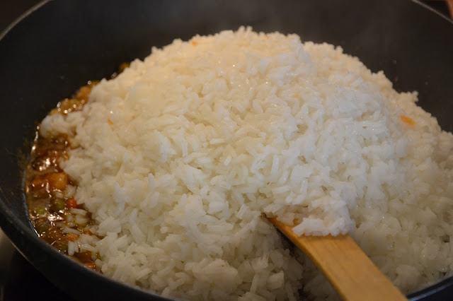 Añade el arroz y revuelve todo bien hasta que el arroz esté impregnado de la salsa y se fría un poco. (Unos 5 minutos moviendo todo el rato)