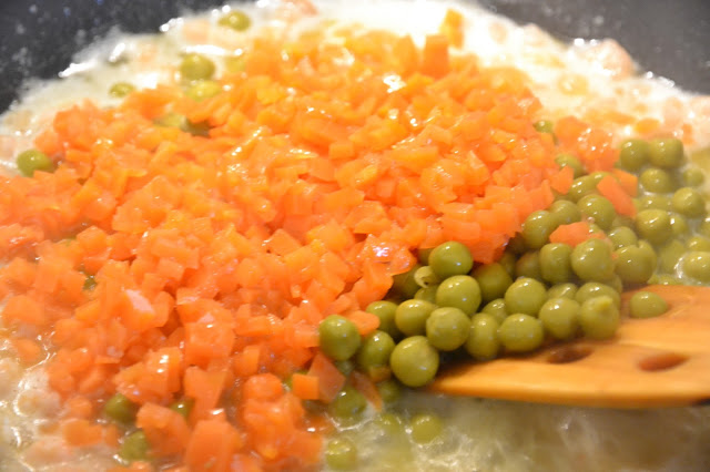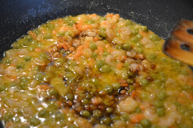 Añade la zanahoria y los guisantes y si ves que tienes mucho líquido sube el fuego para que se evapore.