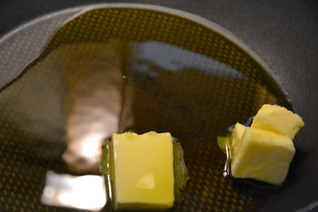 En una sartén grande pon a fuego medio-alto la mantequilla y el aceite.