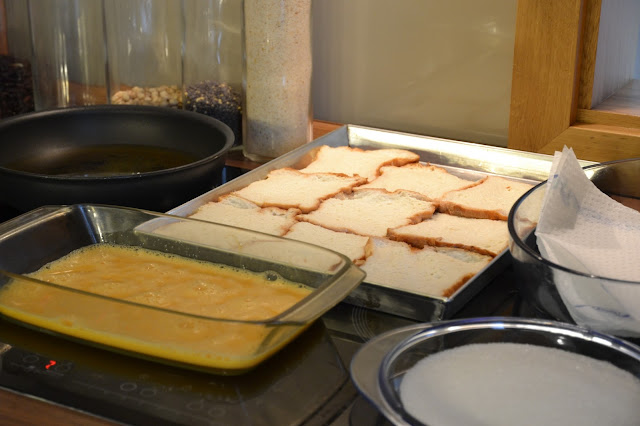 Prepara la sartén con aceite hasta la mitad, el pan, los huevos batidos, otra fuente con papel de cocina para escurrirlas y otro plato con azúcar.