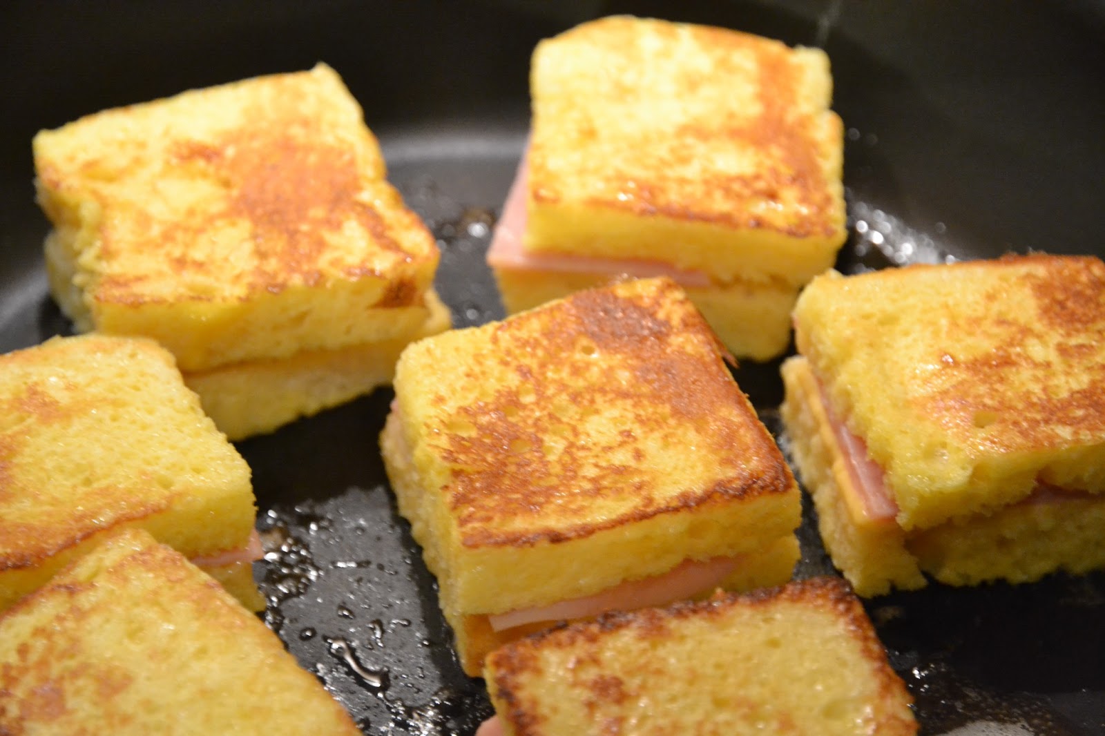 Quita las cortezas al pan. Haz unos sandiwches de jamón y queso con un poco de mantequilla. Córtalos en cuatro.