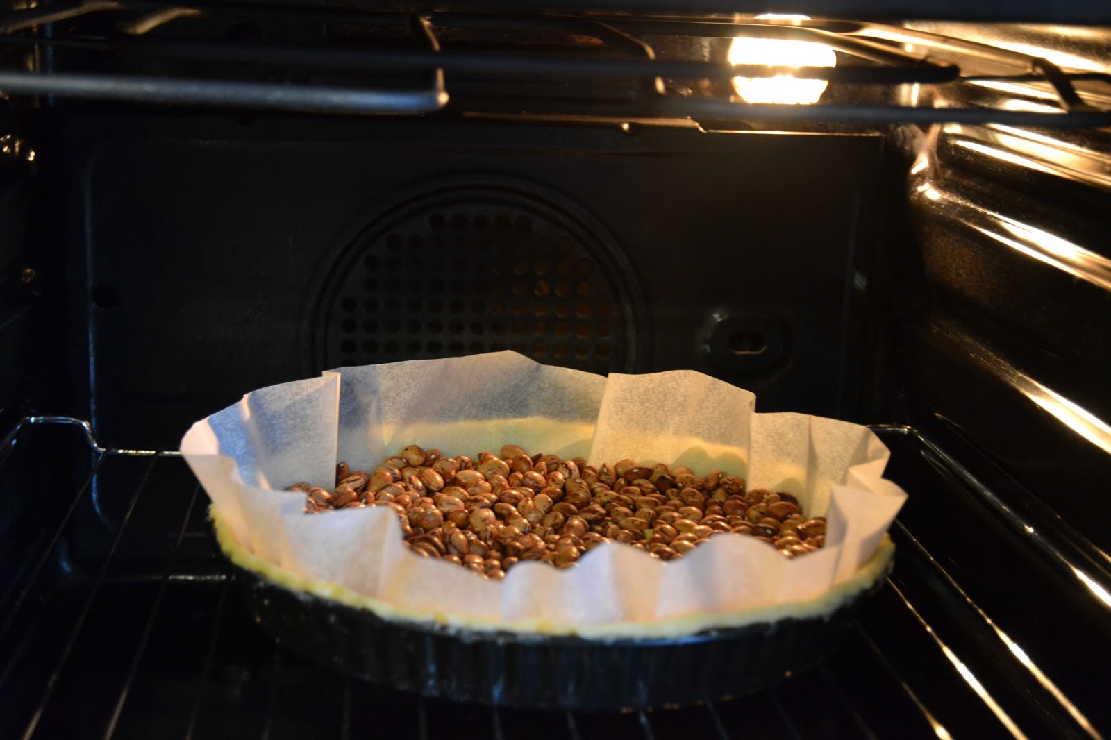 Pon un papel y la legumbre que uses para cocer masas. Métela en el horno 20-25 minutos, dependiendo como te guste de tostada.