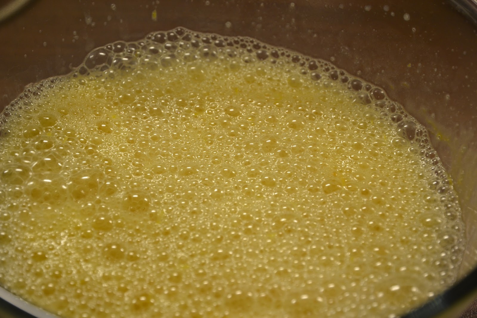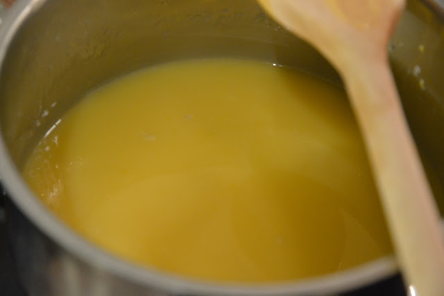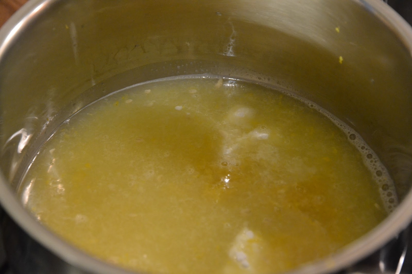 Pon el zumo, la ralladura, el azúcar y la maizena a fuego medio a calentar. Mueve para disolver la maizena.