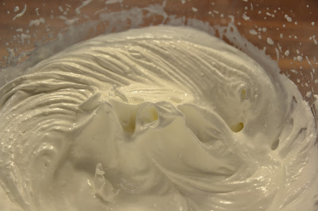 Monta una clara con un tercio del azúcar, añade la siguiente clara y otro tercio de azúcar y sigue batiendo, y la tercera clara y el tercer tercio de azúcar hasta que esté muy duro.