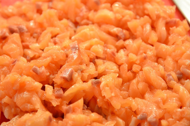 Con un cuchillo bien afilado, corta el salmón en trozos muy pequeños.