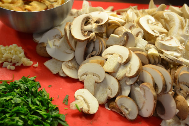 Corta las setas, pica el ajo y el perejil. Si vas a poner setas secas, ponlas a remojar en un poco de agua caliente.