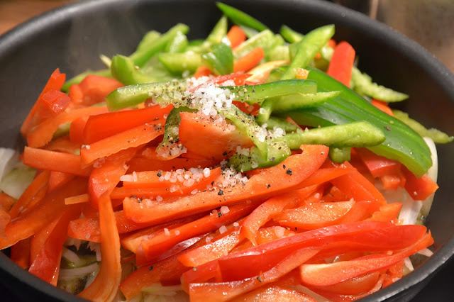 Pon en una sartén a fuego medio-bajo la cebolla y los pimientos cortados en tiras, añade sal y pimienta.