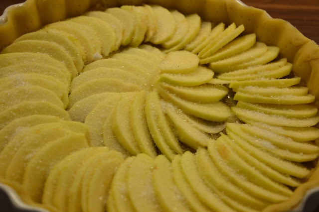 Coloca las láminas de manzana encima, espolvorea con azúcar.