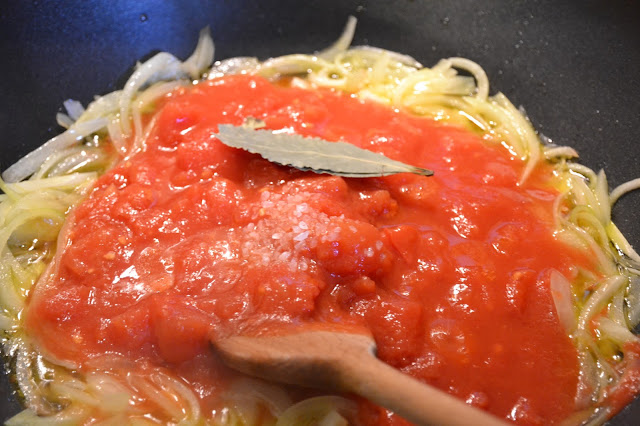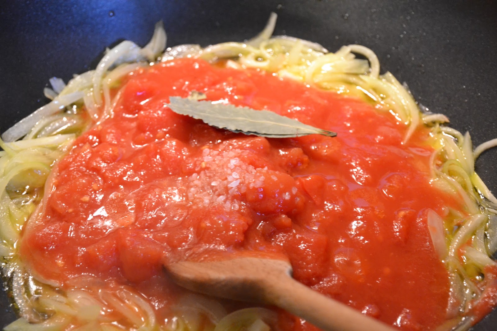 Cuando esté blanda y sin color añade el tomate, el laurel y un poco de sal. Deja que se haga destapada hasta que espese (una media hora).