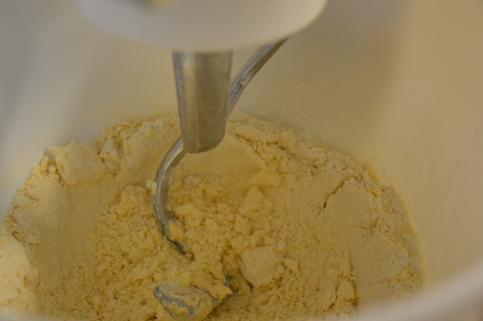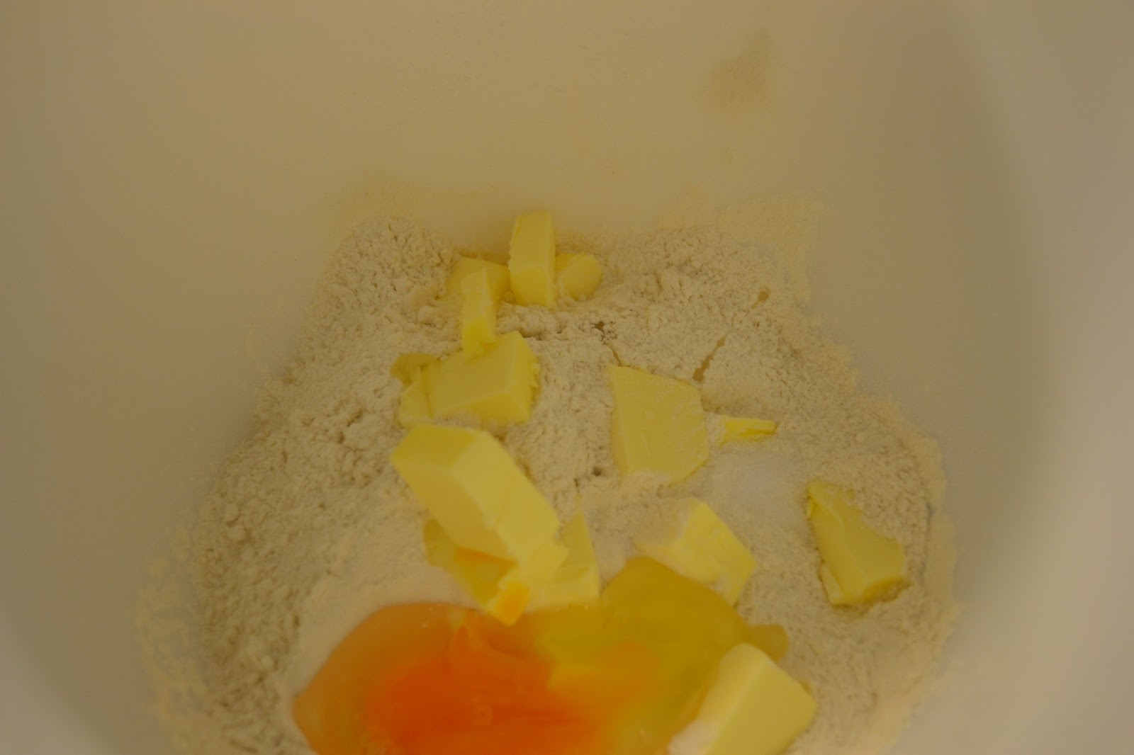 Pon en la máquina o en la encimera haciendo rosca la harina con la mantequilla, el huevo y la sal.