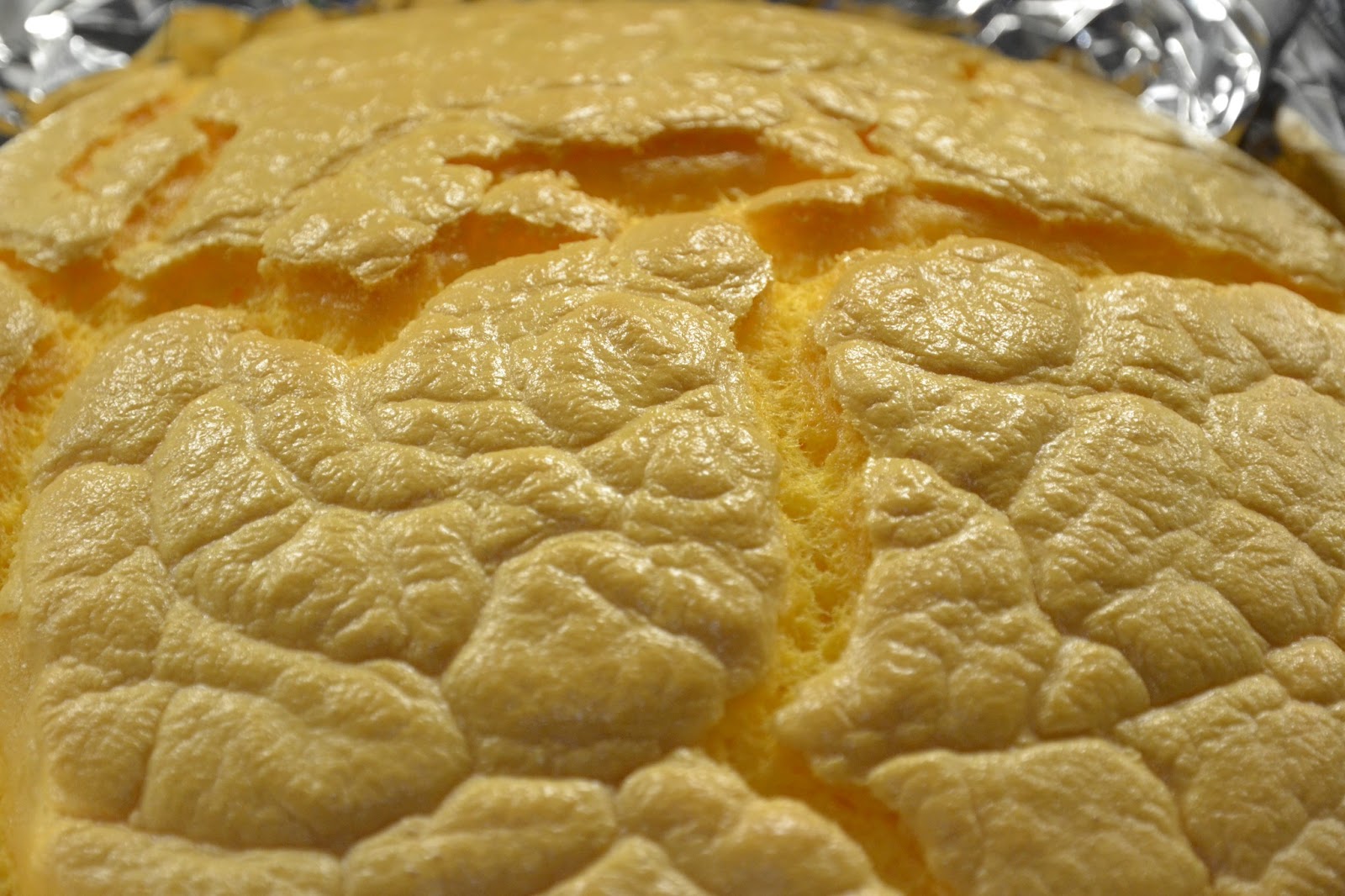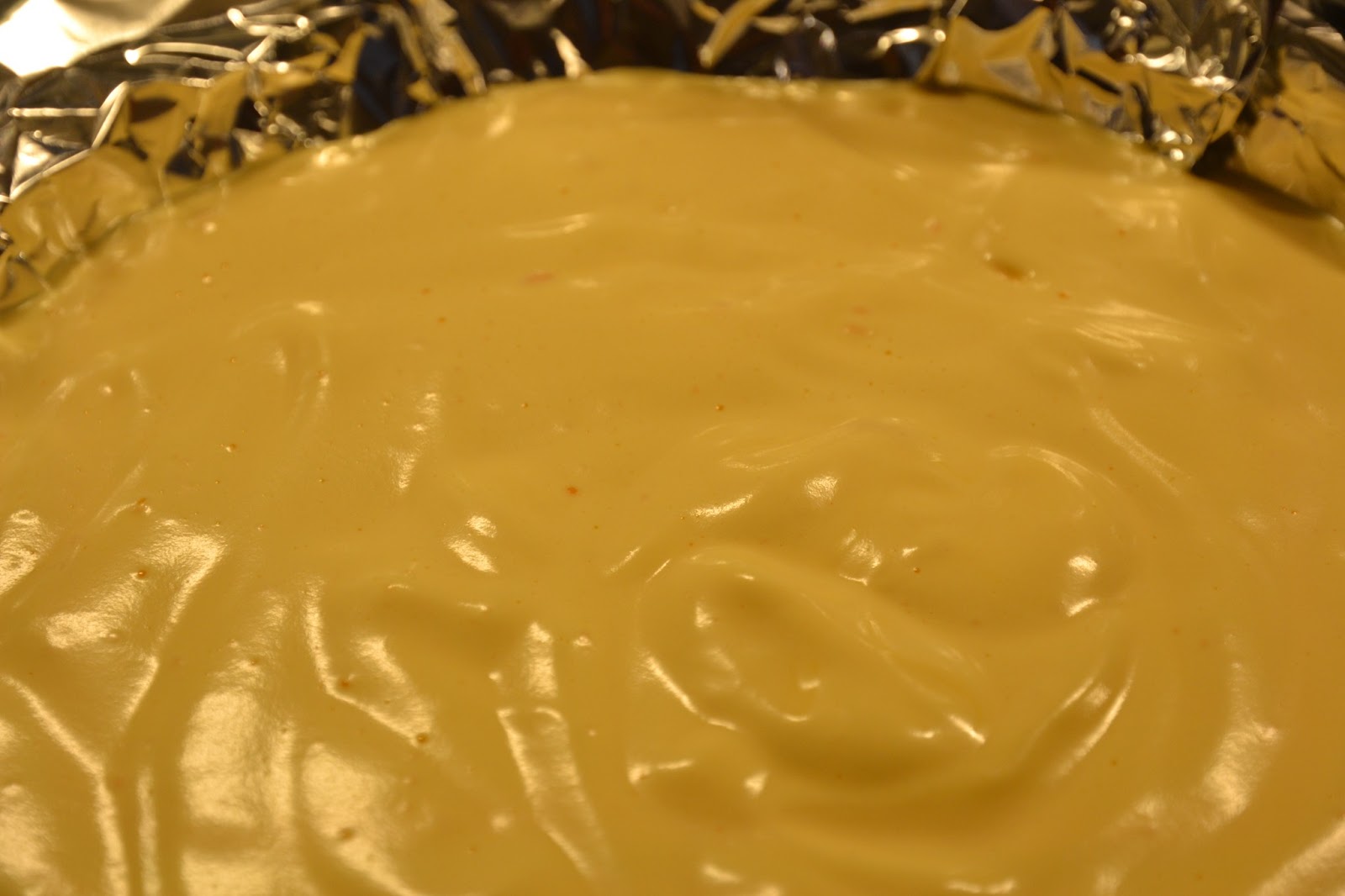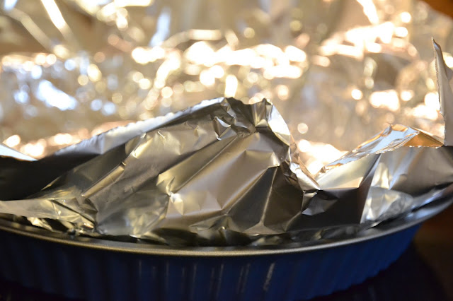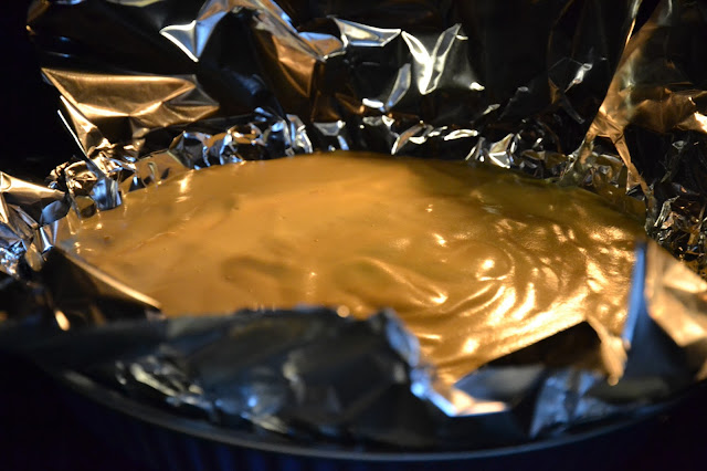 Forra un molde de tarta de 27 cm. de diámetro (o de 25 cm. si es alto) con papel de estaño en las dos direcciones de forma que quede muy bien cubierto.
