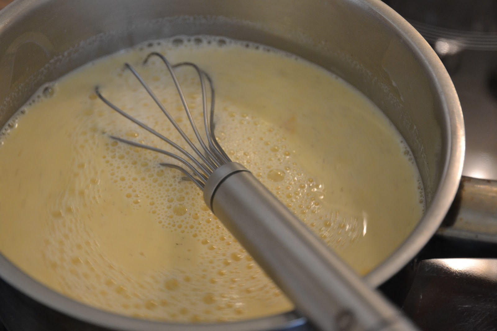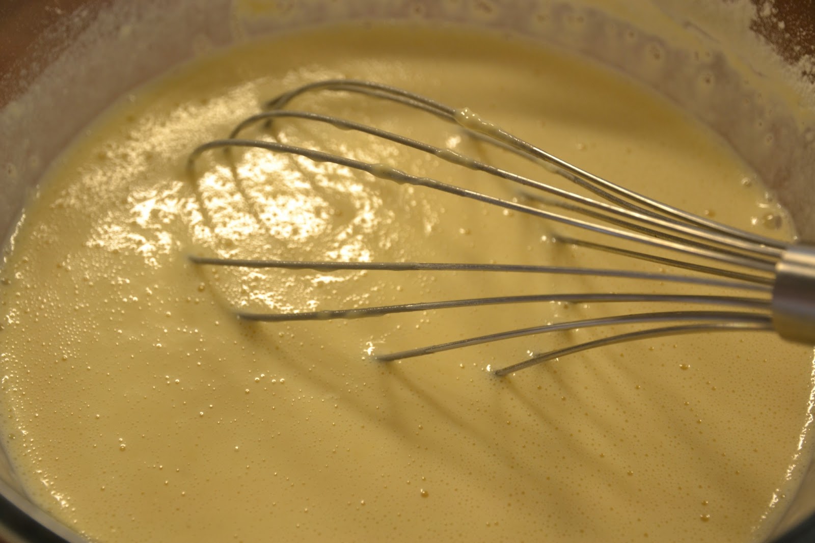 Cuando hierva la leche, añade la mezcla de las yemas y batir sin parar. Baja el fuego y déjalo hervir 5 minutos.