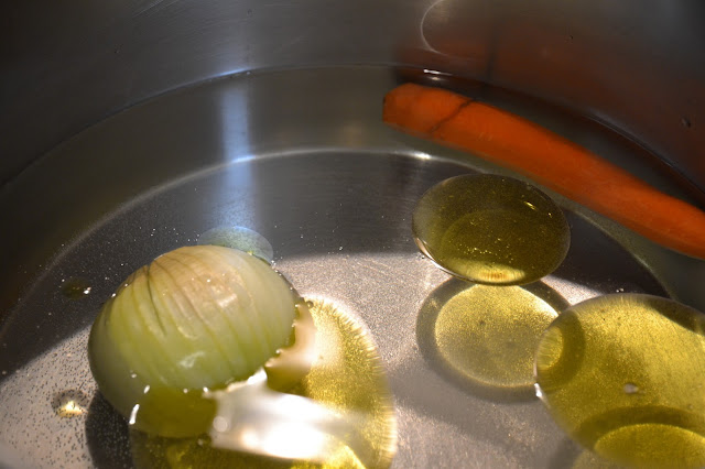 Pon en una cazuela la cebolla, la zanahoria, un chorro de aceite y sal. Cubre de agua y ponlo al fuego para que hierva.